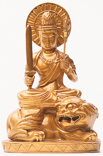 Manjushri (or manjusri) is the embodiement of all the Buddha' wisdom. The word manju means “charming, beautiful, pleasing” and Shri means “glory, brilliance”. The Bodhisattva is regarded as the crown prince of Buddhist teachings, or the one who can best explain the Buddhist wisdom, that is able to extinguish afflictions and bring about enlightenment. Manjushri has this title because eons ago, he was the instructor for seven different buddhas, the last being Sakyamuni Buddha. Manjushri is often depicted with his right hand holding a double-edged flaming sword and his left hand holding a lotus flower on which rests the Prajnaparamita (Great Wisdom) Sutra. He is often seen riding a lion. The Prajnaparamita Sutra on the lotus flower symbolizes wisdom as pure as lotus. The sword represents the sharpness of wisdom that to cut through illusion. The lion is called the king of a hundred animals, and this symbolizes the stern majesty of wisdom. In China he is also portrayed as a child with five topknots. This represents the profound fact of wisdom is as truth, non-dual, purity and innocence as a child mind. When one’s mind is in such a state, one can reflect the truth of everything. The five topknots are the five divisions of the buddha’s wisdom: the wisdom of pure consciousness, the wisdom to reflect all things, the wisdom to regard all things equally and universally, the wisdom of profound insight, and the wisdom to seek the greatest good for oneself and others. It is said that Manjushri came from the land of Ratnaketu Buddha in the east. His strength is on the Buddhist doctrines of non-distinction and non-retraction to attain nirvana. Manjushri was known for his unconventionally straightforward style of teaching. Unlike other Buddha and Bodhisattva’s gradual method progressing from elementary to more complex doctrines, he would jump directly to the top, the meaning of the supreme truth, ultimate nirvana.