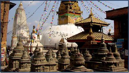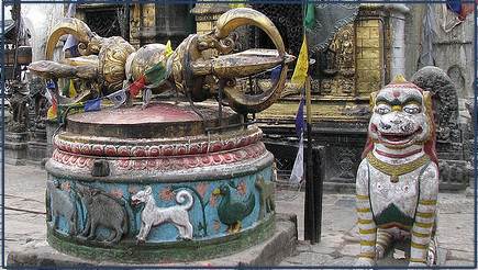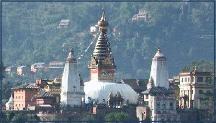 Swayambhunath (Swoyambhunath, a.k.a. Monkey Temple) is an ancient religious complex atop a hill in the Kathmandu Valley. Legend said that this stupa was founded by the great-grandfather of King Mānadeva (464-505), King Vṛsadeva, about the beginning of the 5th century. Much of Swayambhunath's iconography comes from the Vajrayana tradition of Newar Buddhism. However, the complex is also an important site for Buddhists of many schools, and is also revered by Hindus. The complex consists of a stupa, a variety of shrines and temples, some dating back to the Licchavi period. ![]() ![]() ![]()